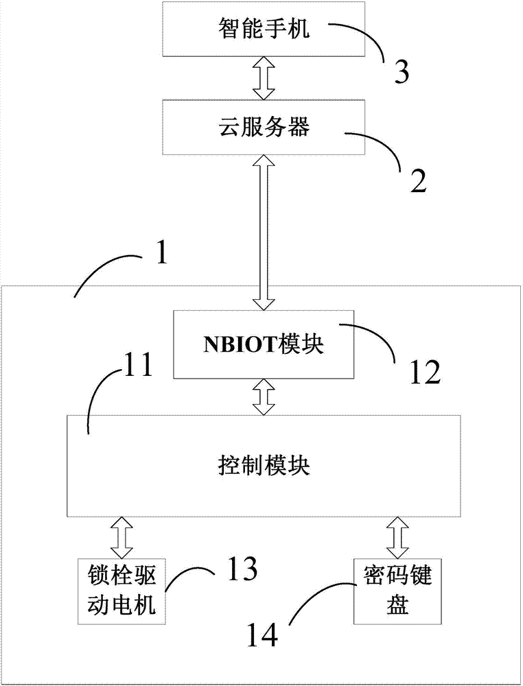 控制模塊11控制所述鎖體解鎖或鎖付,通信模塊12采用窄帶物聯(lián)網(wǎng)通信模塊(即NBIOT模塊),控制模塊11通過NBIOT模塊與一個云服務(wù)器2直接通信。因此,智能手機(jī)3就可以很快捷的通過云服務(wù)器2實現(xiàn)對互聯(lián)網(wǎng)智能門鎖1的運行與管理。